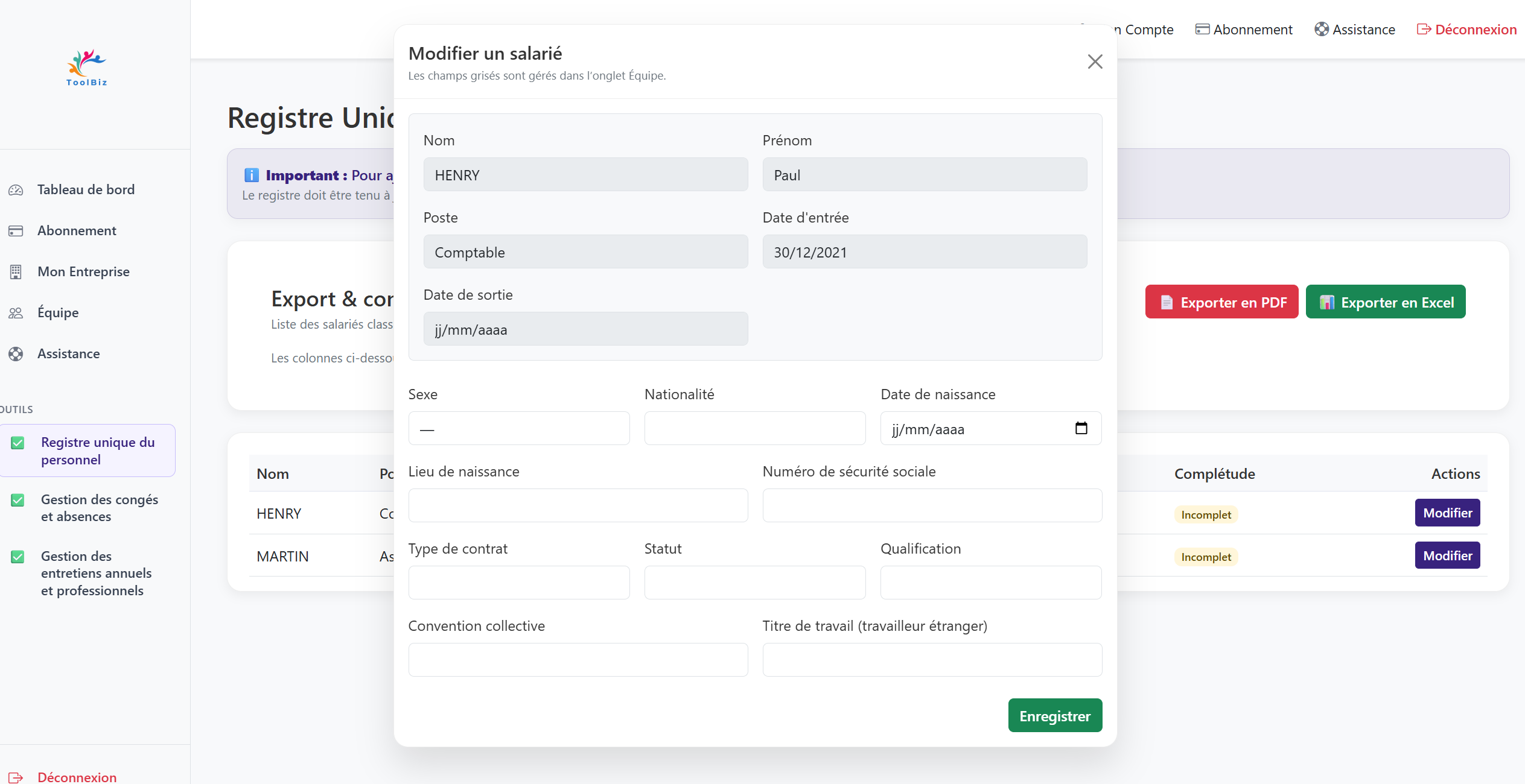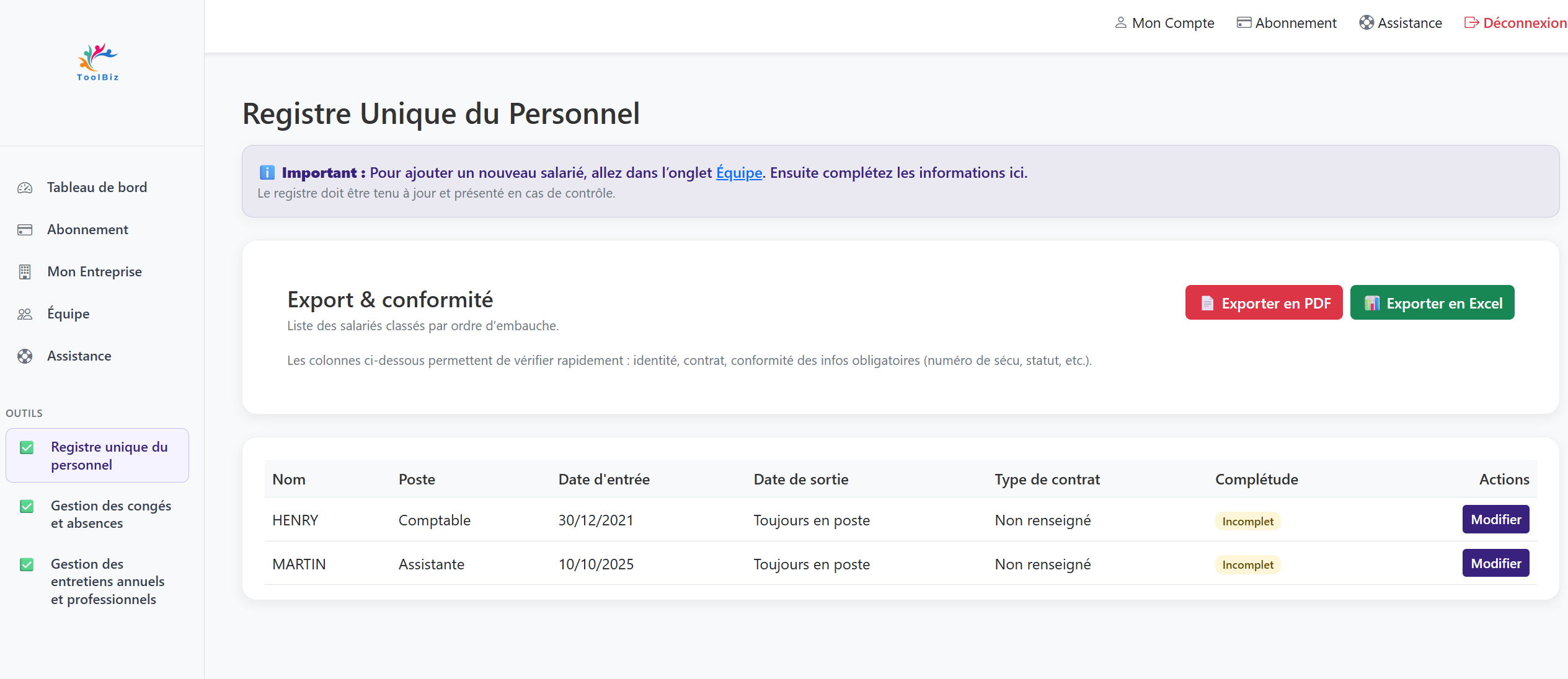 Obligatoire dès le 1ᵉʳ salarié. Toolbiz le met à jour automatiquement, l’archive, le sécurise et génère votre PDF de contrôle en un clic.